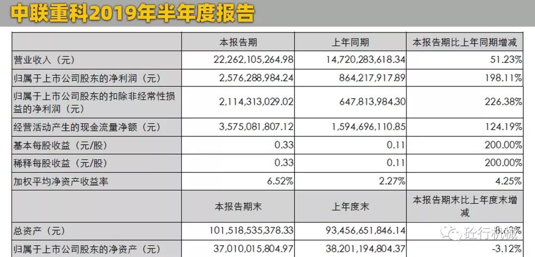2019年上半年,徐工機(jī)械實(shí)現(xiàn)營(yíng)業(yè)總收入311.56億元,同比增長(zhǎng)30.12%。其中包括海外收入44.48億元,同比增長(zhǎng)20.07%;歸屬于上市公司股東的凈利潤(rùn)22.83億元,同比增長(zhǎng)106.82%。相比較2018年上半年,今年上半年徐工的成績(jī)還是很喜人的,特別是在凈利潤(rùn)這一塊,比去年同期增加了一倍之多。