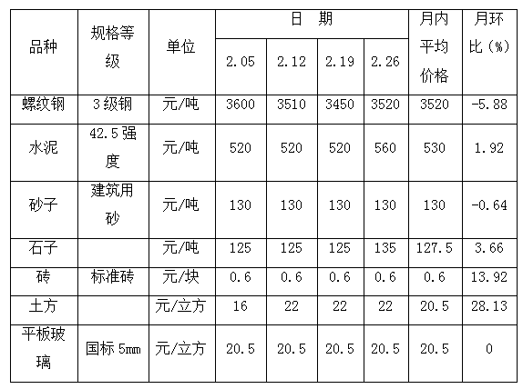 受春節(jié)假期和新冠肺炎疫情影響,2月份山東省濟寧市黃河灘區(qū)遷建物資市場交易量明顯減少,價格變動整體漲跌互現(xiàn)。與上月相比,7種黃河灘遷建物資價格呈4升2降1平態(tài)勢。其中,螺紋鋼的價格震蕩下行,水泥的價格穩(wěn)中有漲,砂子、磚和平板玻璃的價格月內平穩(wěn)運行,石子的價格受季節(jié)性供應減少影響小幅上升,土方的價格呈現(xiàn)高位整理態(tài)勢。