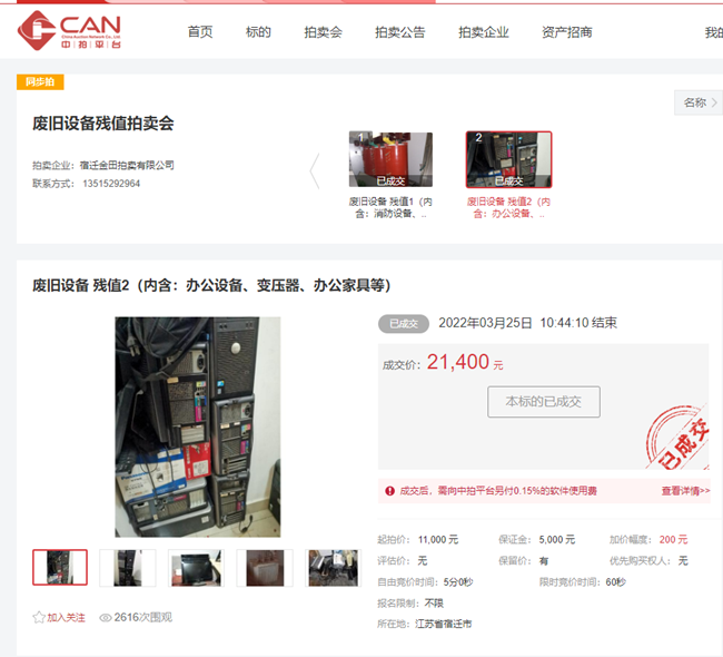 3月25日上午10時(shí)30分,開發(fā)公司一批廢舊辦公設(shè)備、辦公家具、變壓器等物資在中拍平臺(tái)公開拍賣,7家競買人,經(jīng)過14分10秒緊張激烈競價(jià),最終以21400元成交。