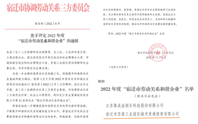 近日,園區(qū)城發(fā)公司獲評2022年度“宿遷市勞動(dòng)關(guān)系和諧企業(yè)” 榮譽(yù)稱號(hào)。