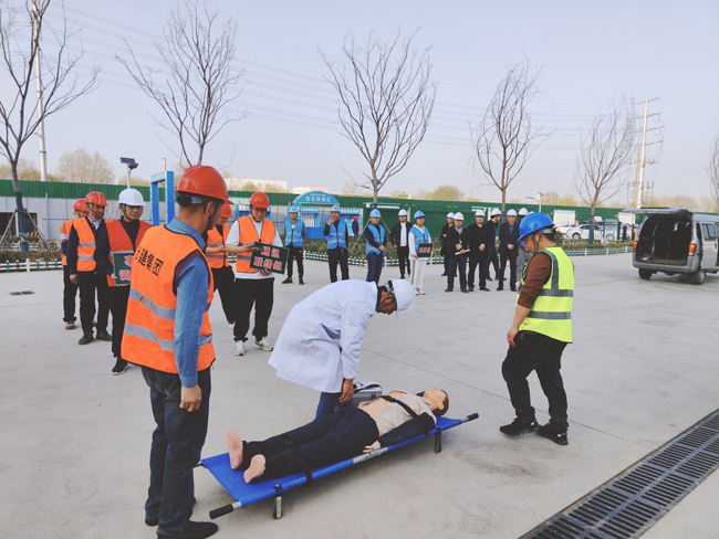 本次演練共分6個小組,分別為:現場模擬組、現場警戒(搶修)組、應急救援(疏散)組、通訊聯絡組、事故調查組、 觀摩組。假設工人在生活區(qū)違規(guī)使用大功率電器突發(fā)火災,被煙霧和火勢圍困,二樓有人發(fā)出救援信號,正在附近巡查的安全員發(fā)現情況后,立即趕赴現場并打電話給項目生產負責人,在接到通知后,項目生產負責人迅速安排項目部應急救援辦公室負責人,并啟動應急預案,各救援小組立即到達現場開展工作,安全員迅速引導全體人員有序從疏散樓梯疏散到安全位置,救援組帶著擔架、急救箱等趕赴現場,將“受傷”人員用擔架從房內撤離到安全位置,同時救援醫(yī)生對“受傷”人員進行簡單的心肺復蘇、人工呼吸,并迅速送往醫(yī)院進行治療。