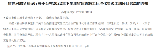 近期,省建設(shè)廳下發(fā) 《 關(guān)于公布2022年下半年江蘇省建筑施工標(biāo)準(zhǔn)化星級工地公示名單 》的通知,城發(fā)公司投資建設(shè)的青年公寓一期土建及安裝工程喜獲“江蘇省建筑施工標(biāo)準(zhǔn)化星級工地”(二星)稱號。該榮譽(yù)的獲得是公司扎實(shí)推進(jìn)省安全生產(chǎn)標(biāo)準(zhǔn)化建設(shè),落實(shí)上級關(guān)于推進(jìn)安全生產(chǎn)標(biāo)準(zhǔn)化建設(shè)工作部署的要求,建立健全管理機(jī)制,積極開展安全文明標(biāo)準(zhǔn)化工地創(chuàng)建所取得的成果,為全省樣板化示范,有效提升建筑施工水平,安全生產(chǎn)發(fā)揮了引領(lǐng)作用。