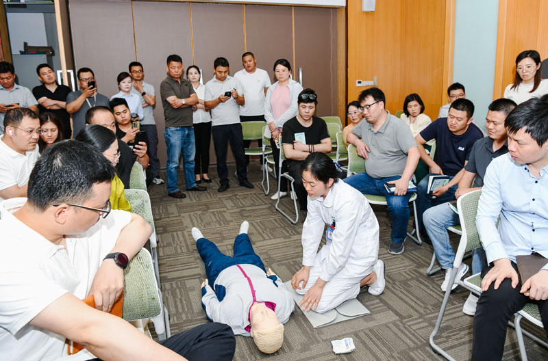 在第一階段活動(dòng)現(xiàn)場,醫(yī)護(hù)人員通過PPT的形式,為大家詳細(xì)講解了心肺復(fù)蘇、AED使用、海姆立克急救法的操作要點(diǎn)和注意事項(xiàng),以及夏季高溫中暑的自救互救應(yīng)急處理知識(shí),并通過互動(dòng)方式一對一指導(dǎo)教學(xué),鍛煉了實(shí)際操作能力。隨后,醫(yī)護(hù)人員也為在場職工進(jìn)行血壓、血糖等項(xiàng)目測量,中醫(yī)把脈問診、家庭醫(yī)生簽約等便民服務(wù),參加此次活動(dòng)的職工紛紛表示受益匪淺。